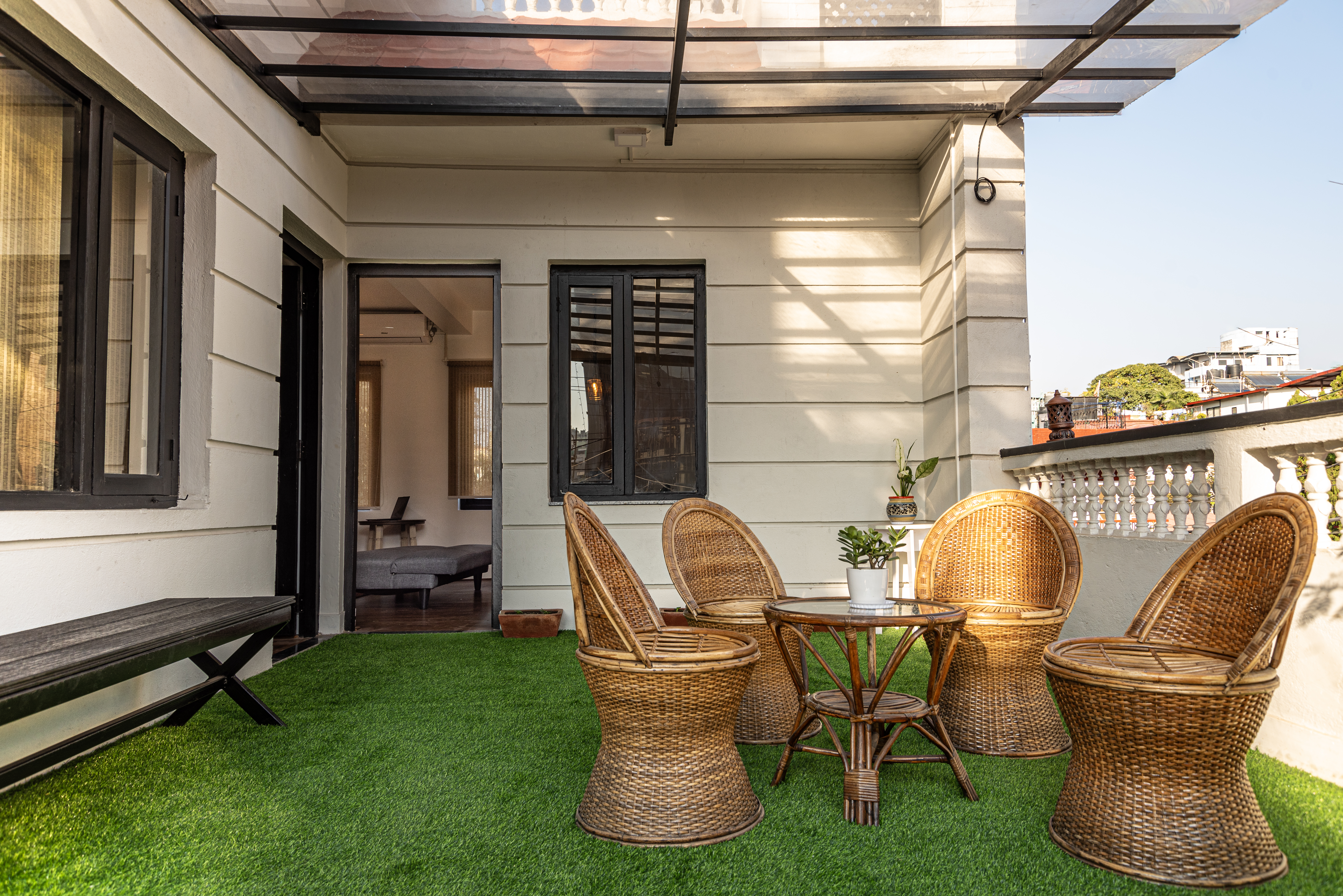 The apartment features a separate bedroom, a relaxed living area, and a fully equipped kitchen that allows guests to dine and live at their own pace. A private garden or terrace adds a soothing touch of greenery, creating a peaceful retreat within Hush City Central.